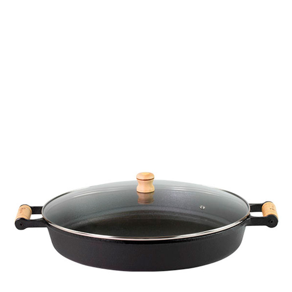 Fabricada em ferro fundido, a frigideira garante aquecimento uniforme e retenção de calor prolongada, resultando em cozimento eficiente e sabor acentuado. A tampa de vidro temperado permite visualizar o preparo sem precisar abrir, mantendo o vapor e a temperatura interna estáveis.
